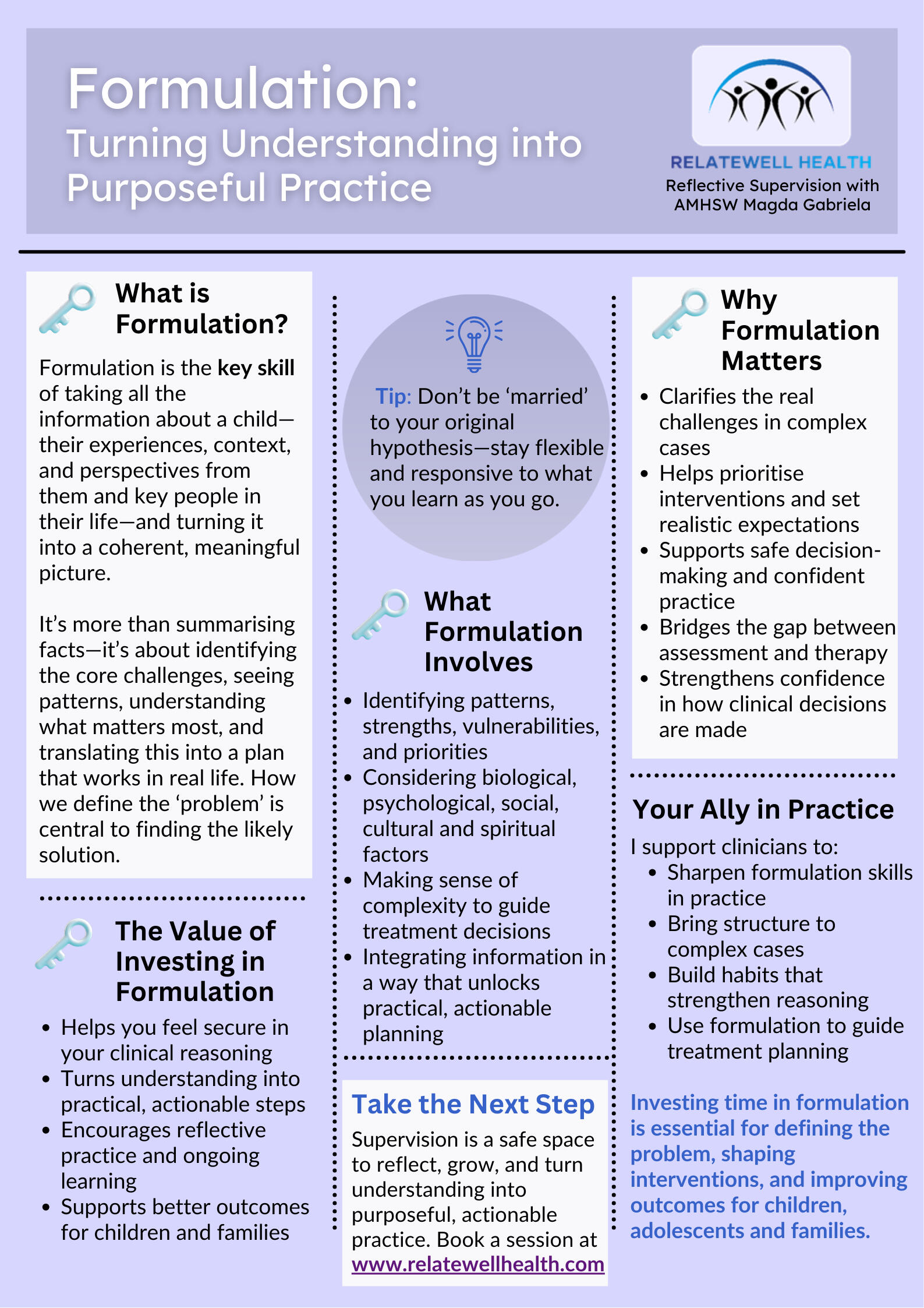 With a background in child protection and child and youth mental health, my supervision is grounded in child development, family systems, trauma-informed care, and relational practice. I'm most likely to be a good fit for you if you're a social worker or allied professional supporting children, adolescents, and families.Supervision with me is collaborative, strengths-based, and clinically focused, helping you deepen formulation, clarify thinking, and build confidence in decision-making, and in holding complexity.I also provide tailored AASW Mental Health Accreditation support. I offer ad hoc guidance or ongoing supervision to map your accreditation journey early and develop skills. Having navigated this pathway myself, I’m committed to helping others avoid confusion, stress, and isolation, balancing practical guidance with space to explore professional identity and purposeAdditional support and resources are available through my free Facebook group for social workers pursuing accreditation: bit.ly/relatewellamhsw. See the FAQ for details.