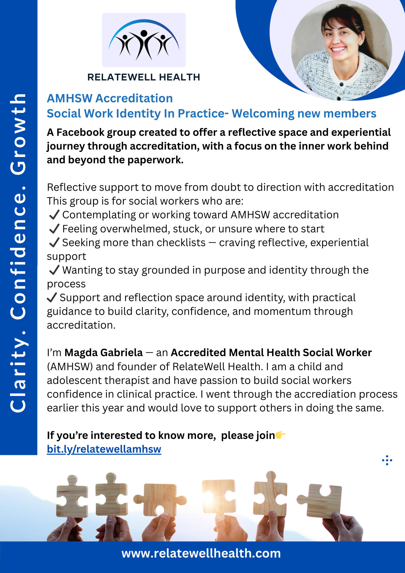 You’re welcome to join my free Facebook group — AMHSW Accreditation & Social Work Identity in Practice. — for those on the accrediation path. The group is designed to help you take proactive steps early, move past obstacles, reduce isolation, keep you motivated and connect with peers going through the process. Through weekly tips, reflection prompts, and insights, we focus on deep reflective practice to build skill, insight, and confidence in the social worker you’re becoming. If this resonates, please join here: bit.ly/relatewellamhsw